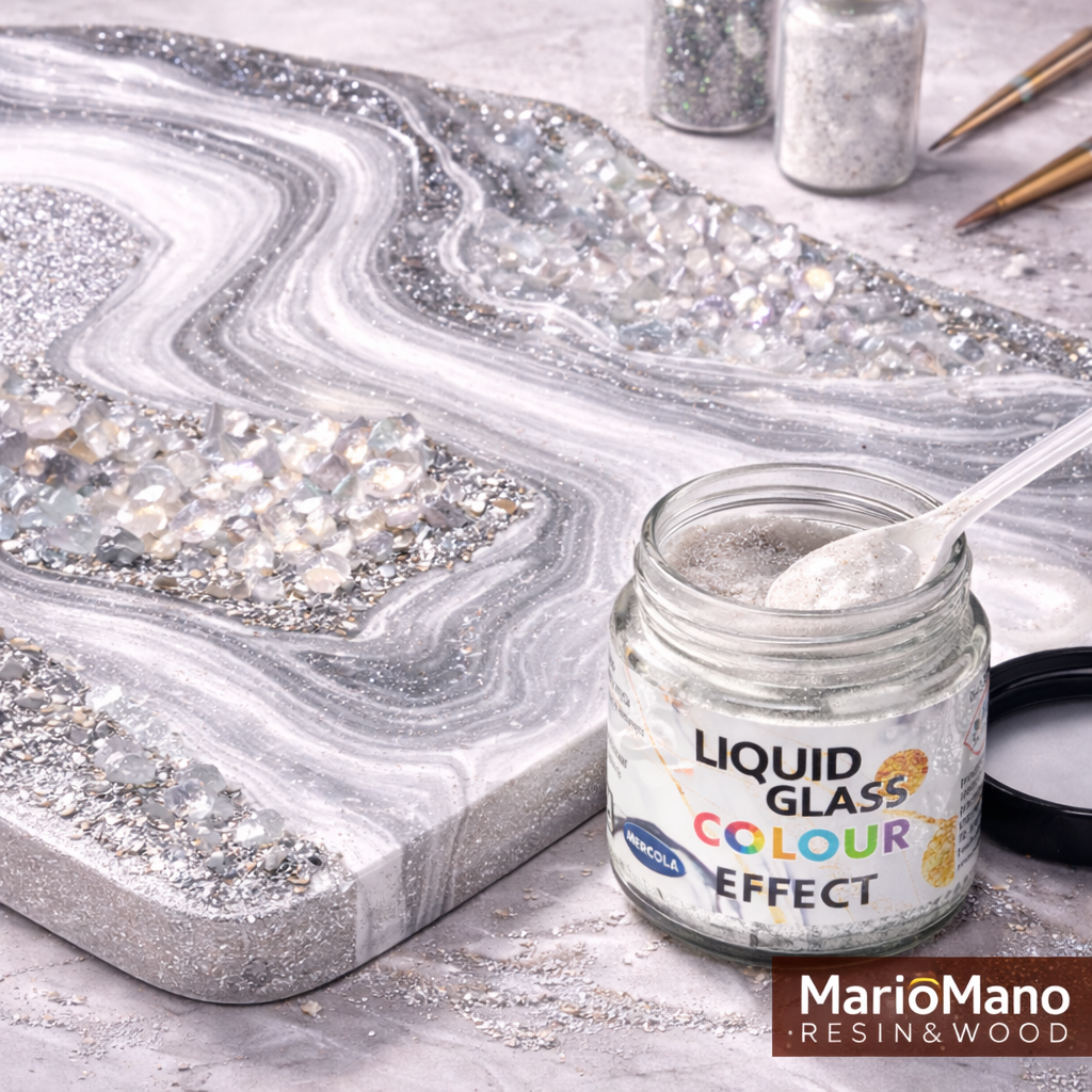 Όταν θέλω να δώσω πιο μοντέρνο και λαμπερό αποτέλεσμα στις κατασκευές με ρητίνη, χρησιμοποιώ ασημί μεταλλικές χρωστικές γιατί δημιουργούν πολύ όμορφο metallic εφέ μέσα στη ρητίνη.