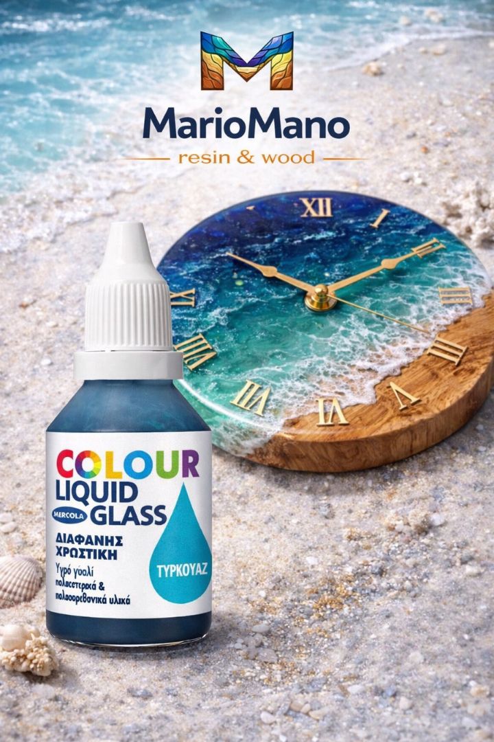 Όταν δημιουργώ θάλασσα ή κύματα με ρητίνη υγρού γυαλιού, το τυρκουάζ είναι από τα χρώματα που χρησιμοποιώ συχνά για να δώσω το φωτεινό, ρηχό χρώμα της θάλασσας κοντά στην ακτή. Ξεκινάω πάντα με λίγες σταγόνες και προσθέτω σταδιακά μέχρι να πετύχω το αποτέλεσμα που θέλω.